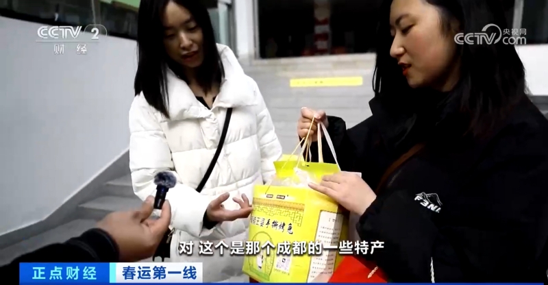 返乡旅客 任红梅:对,这个是那个成都的一些特产,成都特别出名的那个双流兔头,所以给家人买了让尝一点。