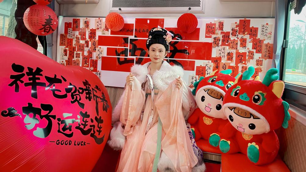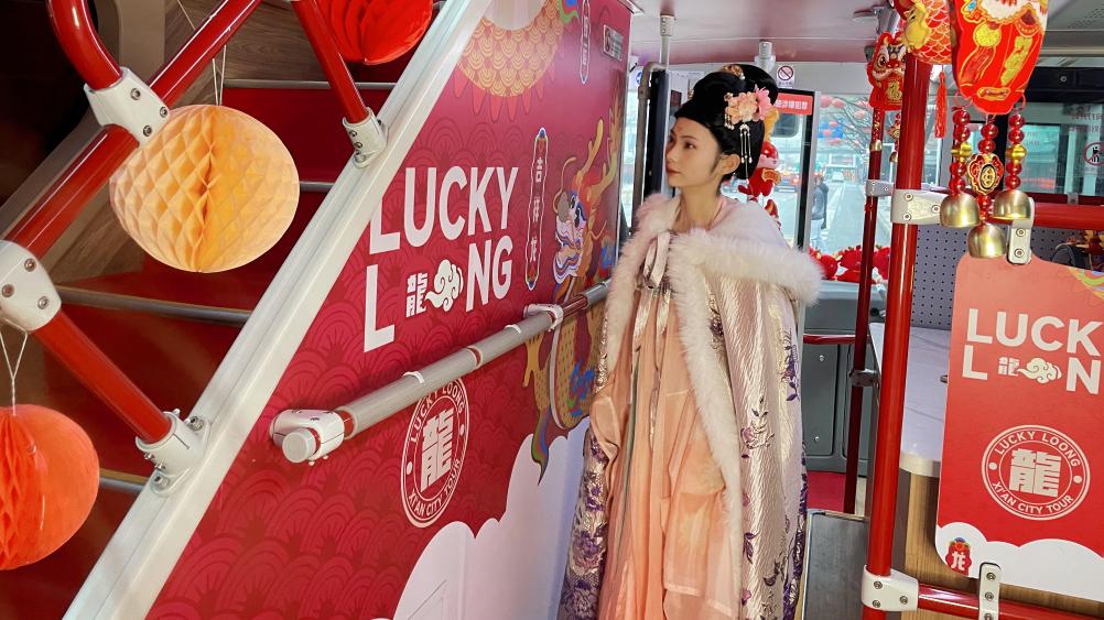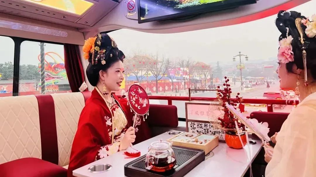 “龙”元素将车体装扮一新,李白、杨贵妃等大唐名人全程陪同讲解,串联起钟楼、大雁塔、陕西历史博物馆、大明宫国家遗址公园等多个景点,充满节日氛围的龙年主题观光车备受游客青睐。