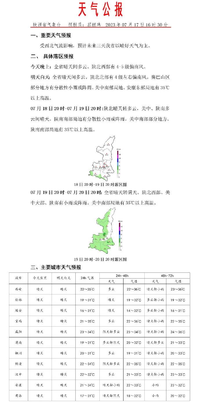 预计 7 月 24 日-8 月 11 日西安市平均气温 26~28℃,与常年同期相比略偏低 0~0.5℃;降水量 30~60mm,与常年同期相比略偏多 0~1 成。