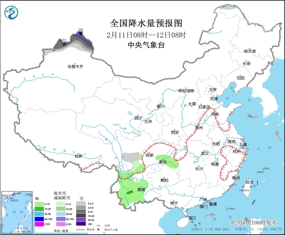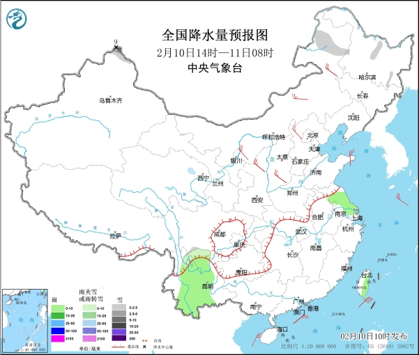 图1 全国降水量预报图(2月10日14时-11日08时)