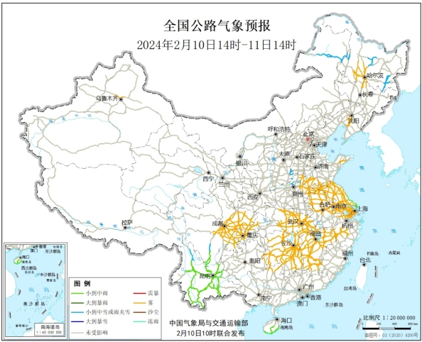 预计2月10日下午至11日下午,内蒙古东北部、黑龙江中西部和东南部、川西高原南部等地部分道路受小雪或雨夹雪影响;四川南部、云南、江苏中南部等地部分道路受小雨影响。另外,辽宁中部、吉林北部、黑龙江西南部、江苏大部、浙江中北部、安徽中北部、江西大部、山东东部和南部、河南北部、湖北中东部、湖南大部、广西北部、重庆西部、四川中东部、贵州东部等地部分道路受雾影响能见度低(见图3,附件1)。
