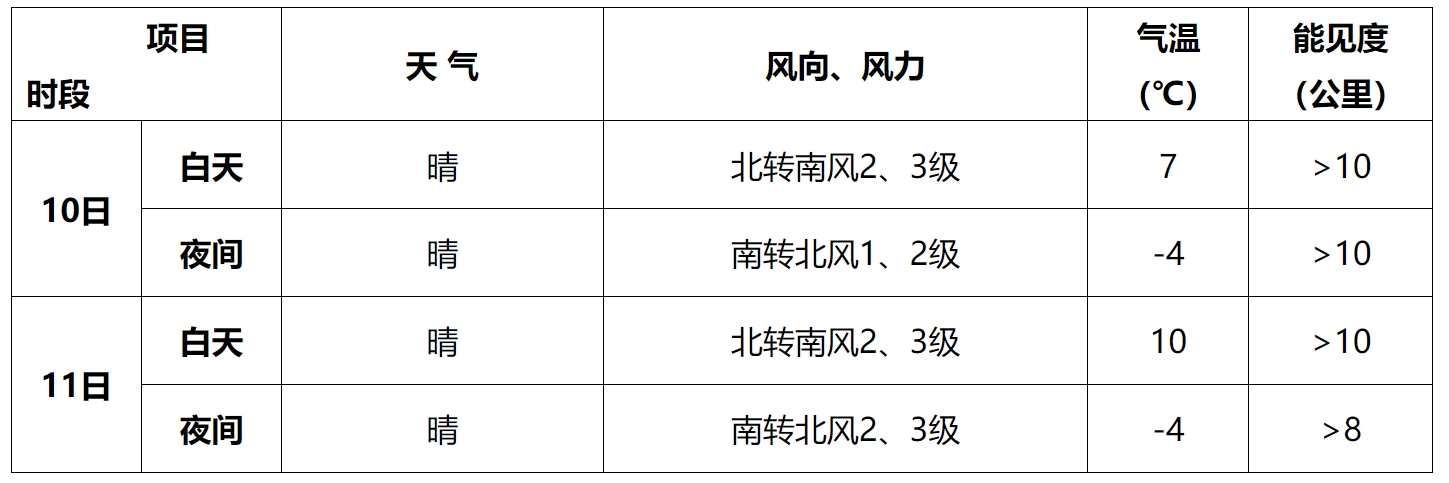 预计,2月10日至11日北京地区天气晴朗,风力不大;气温呈回升趋势,白天最高气温7~10℃,夜间最低气温-4℃左右。