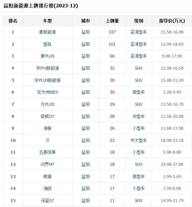 第三方平台数据显示,去年12月,代管沅江的益阳市销量排名前15的新能源车型中,有8款是比亚迪车型,且多集中在10至15万元的价格段。