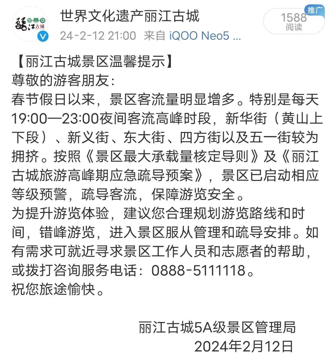 红红火火过大年,热热闹闹迎新春。今天是春节假期第四天,丽江古城处处洋溢着浓浓的年味,旅游市场也持续升温,迎来客流小高峰。2月12日晚,丽江古城官方微博发布温馨提示,提醒广大来丽游客避开夜间客流高峰时段,错峰游览。