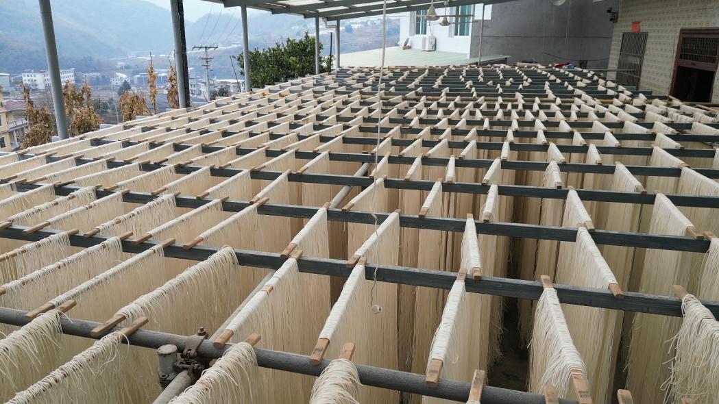 粉条是岚皋的特色美食,其手工制作工艺已有几百年历史,是春节期间岚皋人餐桌上不可或缺的一道美味佳肴。蔺河黄氏粉条在岚皋县可谓家喻户晓。走进蔺河镇茶园村三组的黄氏粉条加工厂,“粉条挂满园”的壮观场景跃然眼前,在太阳的照射下如一条条金丝般闪耀着光芒,店主黄琳正在为顾客装货、称重,忙个不停。