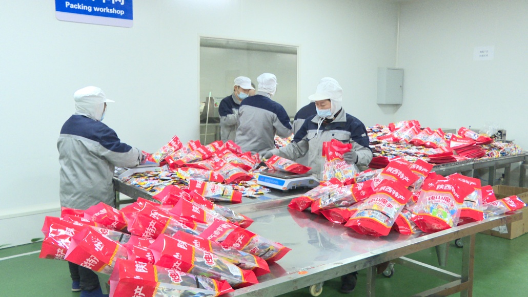 烛山食业有限公司生产车间内,工人们正在进行年货产品包装。