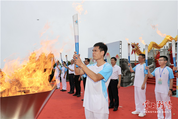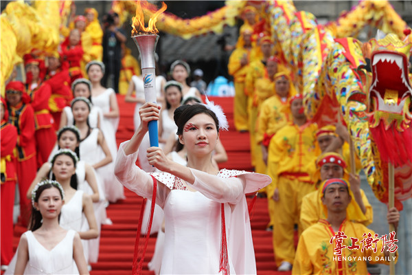 在吟诵《喜迎圣火告祝融文》之后,随着六佾乐舞和长号声,14名圣火少女缓缓登上祝融寺前坪圣火采集区,成功采集象征光明、团结和友谊的圣火,持火圣女缓步踏下台阶。秦国文从圣火少女手中接过取火棒,在现场热烈的欢呼声中高举展示,并为熊倪点燃第一棒火炬,正式开启火炬传递。曹普华从熊倪手中点燃火炬,并点燃圣火盆。