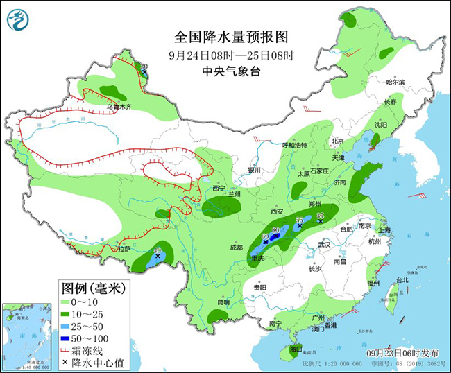 9月24日08时至25日08时,新疆北疆和沿天山地区、西藏东南部、西北地区东南部、内蒙古东北部、辽东半岛、山西南部、黄淮、川西高原北部、西南地区东北部、江汉西部和北部、海南岛等地的部分地区有中到大雨,其中,重庆东北部、湖北西北部等地的部分地区有暴雨(50~80毫米)。内蒙古中东部、辽东半岛等地部分地区有4~5级风(见图3)。