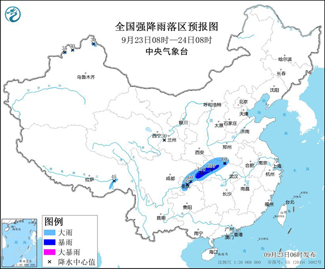 其中,9月23日08时至24日08时,四川东部、重庆大部、贵州北部、湖北中西部、河南南部等地的部分地区有大到暴雨,其中,重庆东北部、湖北西部局地有大暴雨(100~110毫米)。上述部分地区伴有短时强降水(最大小时降雨量20~40毫米,局地可超过50毫米)。中央气象台9月23日06时继续发布暴雨蓝色预警(见图1)。