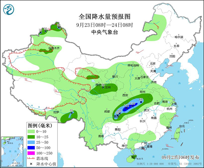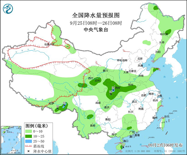 图2 全国降水量预报图(9月23日08时-24日08时)