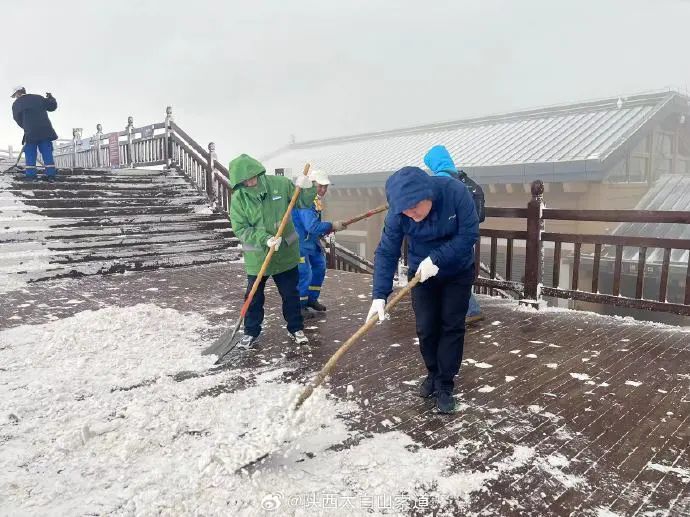 太白山索道职工立即前往清理路面积雪,保障游客游玩安全。