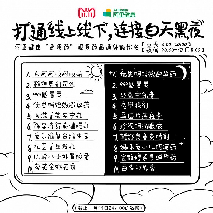 东阿阿胶阿胶块、雅塑奥利司他、999感冒灵等排行白天销售额前十。优思明短效避孕药、达克宁乳膏、妈咪爱小儿腹泻药等排名夜间销售额前十。
