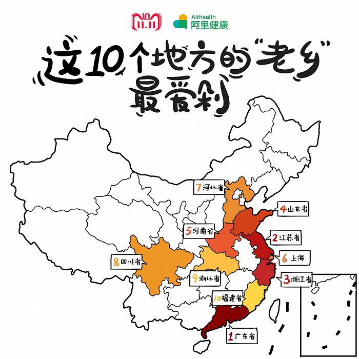 哪些地区的“老乡”最爱剁手?阿里健康电商平台双11销售数据显示,广东、江苏、浙江三省老乡在今年最舍得投资健康,而山东省、河南省和上海市紧随其后,值得注意的是,北京意外地没有进入前十,仅名列第12位。