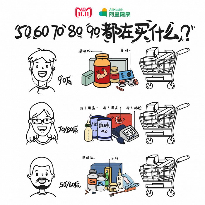 50和60后人群则对健康生活品质尤为看重,数据显示,三七粉、血压计和血糖仪分列这部分人群最爱买的健康产品前三位。今年重阳节期间,阿里巴巴发布的《“银发族”消费升级数据》和《重阳节消费报告》曾显示以50、60后人群为代表的“银发族”购买的医学美容的支出是去年的4.4倍,抗衰老、除皱产品、水光针等成为热门。