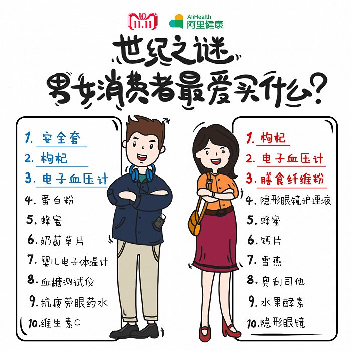 从性别来看,男女两类人群在购物车的成分构成上同样差异明显。计生用品毫无意外地成为男性最爱买的双11健康榜单第一名,而我们也惊喜的发现,男性用户远比想象中顾家,婴儿电子体温计挤进男性爱买榜前十。