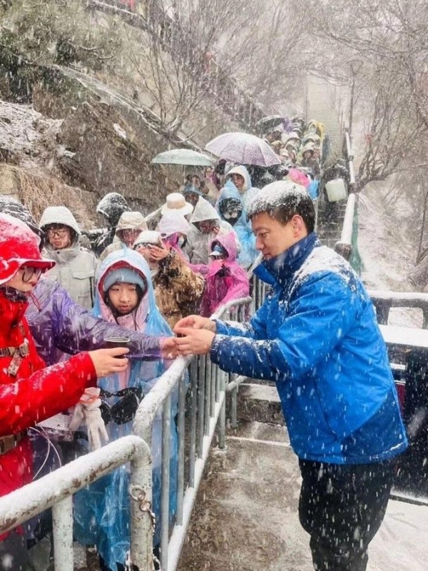 2月14日,华山景区突降大雪,索道运力较慢,华管委紧急启动预案,华旅集团、三特索道、太华索道等单位免费为游客提供雨衣、姜汤、热水等。