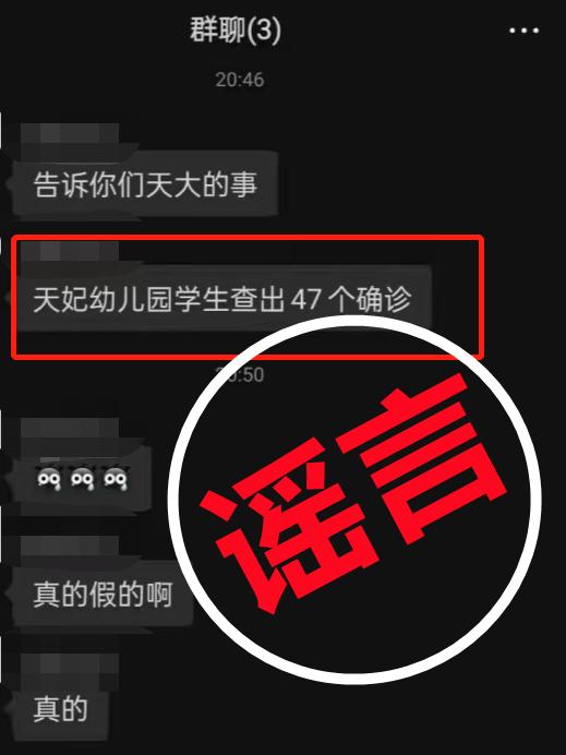 3月14日,有网民在嘉兴当地微信群流传出一则“天妃幼儿园学生查出47个确诊”的聊天记录,在社会上造成一定的影响。该内容纯属谣言,公安机关已介入调查,发布者本人也于3月15日在朋友圈发布澄清信息。