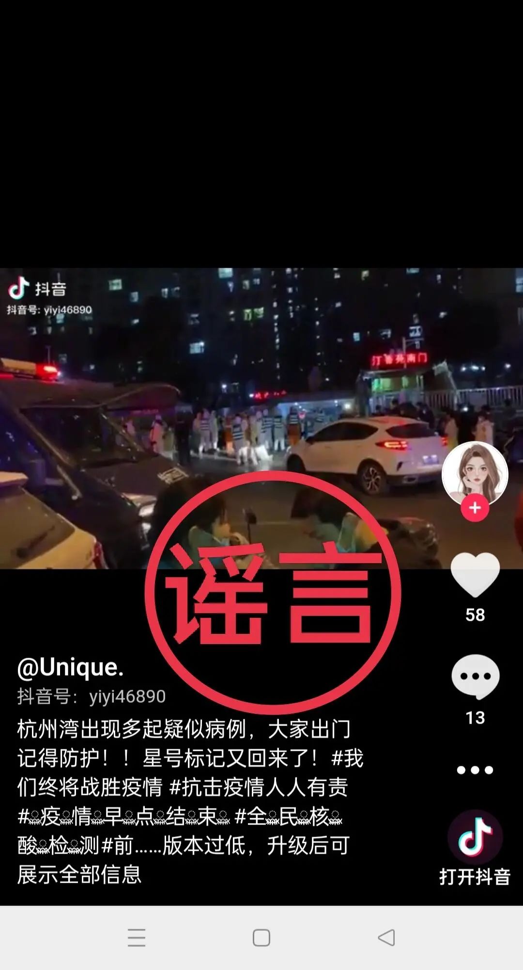 3月15日,抖音号yiyi46890发消息称,“杭州湾出现多起疑似病例,大家出门记得防护!!星号标记又回来了”,同时配有一段医护人员和警车的短视频。经官方确认,此为假消息。
