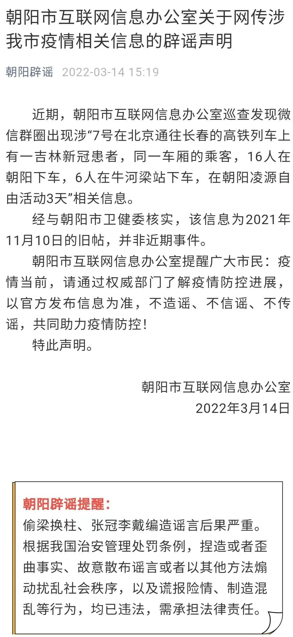 据“朝阳辟谣”微信公众号消息,近期,微信群圈出现涉“7号在北京通往长春的高铁列车上有一吉林新冠患者,同一车厢的乘客,16人在朝阳下车,6人在牛河梁站下车,在朝阳凌源自由活动3天”相关信息,经辽宁省朝阳市卫健委核实,该信息为2021年11月10日的旧帖,并非近期事件。