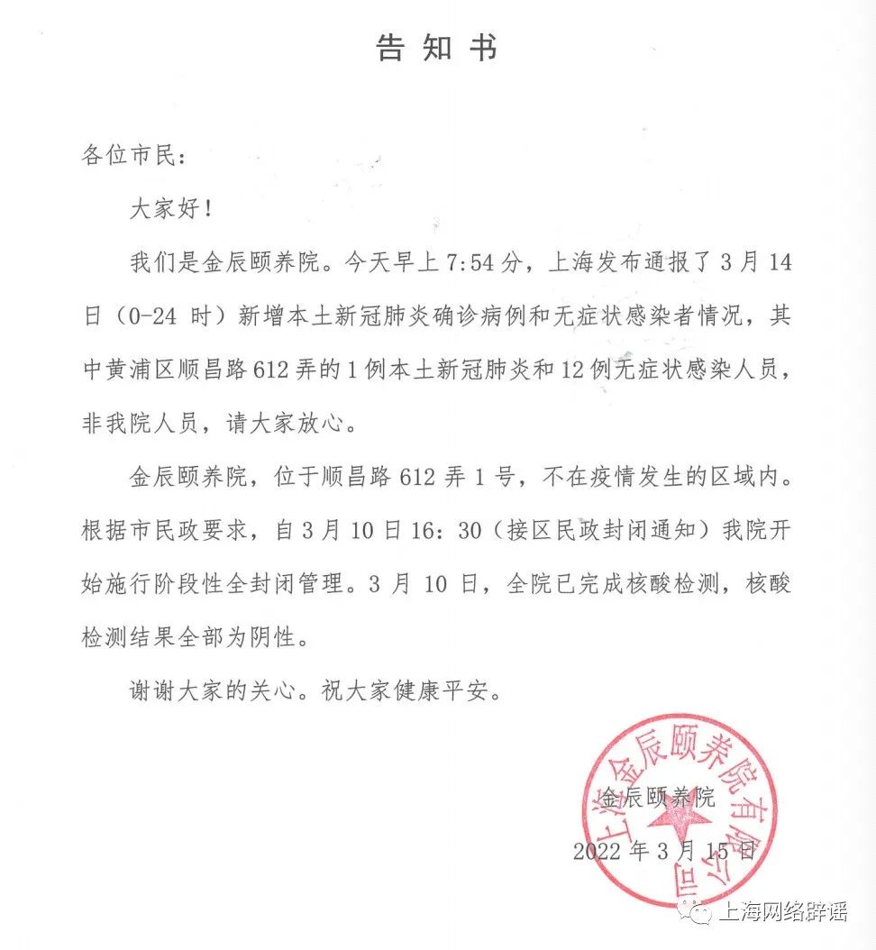黄浦区相关部门答复称:经核实,金辰颐养院内无人员感染新冠肺炎。网传“金辰颐养院”内发生疫情感染为不实信息。今晨上海发布公布的顺昌路612弄的无症状感染者皆为该小区居民,非金辰颐养院住院老人。