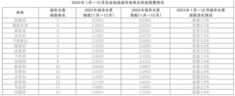 原标题:省生态环境厅发布2023年1月—12月全省14个地级城市及兰州新区地表水环境质量排名情况