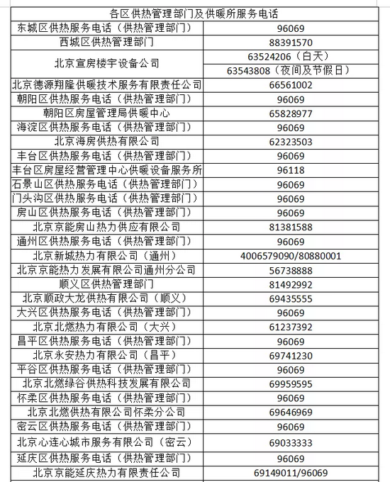 进入供暖季,市城管委已经公布了各区供热管理部门电话,市民家中如果出现暖气不热、跑水漏水等情况,可以直接拨打小区供热单位服务电话报修解决;如果供热单位没有及时处理或者小区没有点火试运行,可以拨打市、区供热服务监督电话进行投诉。