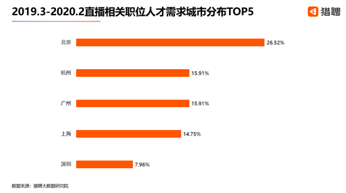 2019年3月-2020年2月,在直播类职位人才需求占比最高的前5个城市中,北京以26.52%的占比位居榜首。“千年商都”广州与素有电商大本营之称的杭州并列第二,人才需求占比均为15.91%。上海以14.75%的占比紧随其后。深圳则以7.96%的占比挤入前五。