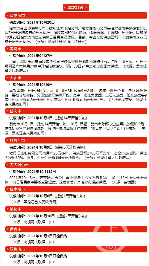 ▲黑龙江省部分城市供热时间表。图片来源/综合