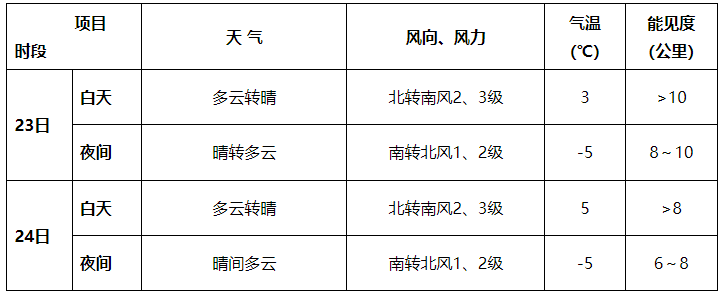 预计23日至24日,北京地区天气以晴到多云为主,最高气温逐步回升,白天最高气温3~5℃;夜间最低气温-5℃左右。24日能见度有所降低,夜间最低能见度6~8公里。具体预报见附表。