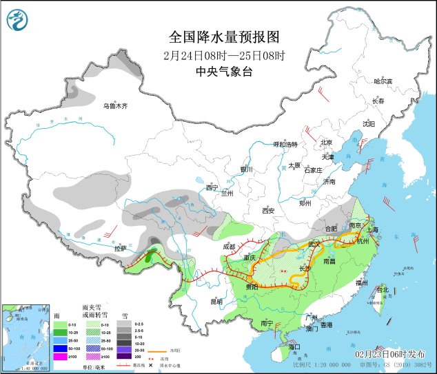23日下午至夜间,西北地区东部、西藏东部、川西高原、黄淮南部、江汉、江淮、江南北部和西部及贵州东部等地有小到中雪或雨夹雪,西藏东部、陕西南部、湖北东部等地部分地区有大雪,局地暴雪;西藏东南部、云南西北部等地部分地区有大雨,局地暴雨(见图1)。