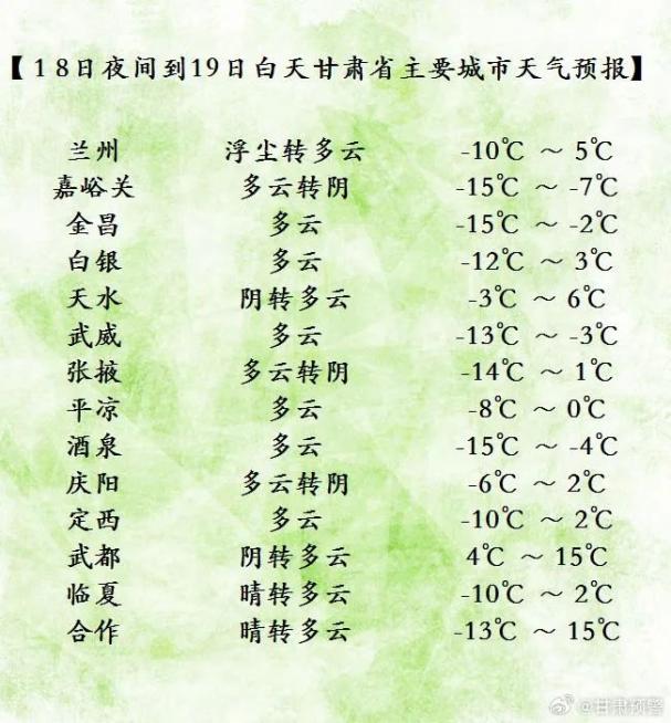 明天夜间到后天白天(02月19日20时-02月20日20时),定西、陇南、天水、平凉、庆阳等市及白银市南部阴有小雪(雨)或雨夹雪,其中庆阳市局部地方有中雪;省内其余地方多云,其中酒泉、张掖、临夏、甘南、兰州等市州局部地方阴有小雪。