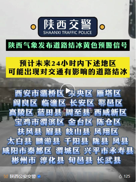 预计未来24小时内下述地区可能出现对交通有影响的道路结冰:西安市灞桥区、未央区、雁塔区、阎良区、临潼区、长安区、鄠邑区、高陵区、蓝田县、周至县、西咸新区,宝鸡市渭滨区、金台区、陈仓区、扶风县、眉县、岐山县、凤翔区、太白县、麟游县、千阳县、陇县、凤县,咸阳市秦都区、渭城区、兴平市、武功县、三原县、泾阳县、礼泉县、乾县、永寿县、彬州市、淳化县、旬邑县、长武县,铜川市王益区、印台区、耀州区、宜君县,渭南市临渭区、华阴市、华州区、潼关县、大荔县、澄城县、合阳县、蒲城县、富平县、白水县,延安市宝塔区、安塞区、黄陵县、黄龙县、宜川县、洛川县、富县、甘泉县、吴起县、志丹县、子长市、延川县、延长县,榆林市榆阳区、横山区、神木市、府谷县、定边县、靖边县、绥德县、米脂县、佳县、吴堡县、清涧县、子洲县,汉中市南郑区、城固县、洋县、勉县、西乡县、略阳县、镇巴县、宁强县、留坝县、佛坪县,安康市汉滨区、汉阴县、石泉县、宁陕县、紫阳县、岚皋县、平利县、镇坪县、旬阳市、白河县,商洛市商州区、洛南县、山阳县、镇安县、丹凤县、商南县、柞水县,杨凌示范区杨陵区,韩城市,请注意防范。