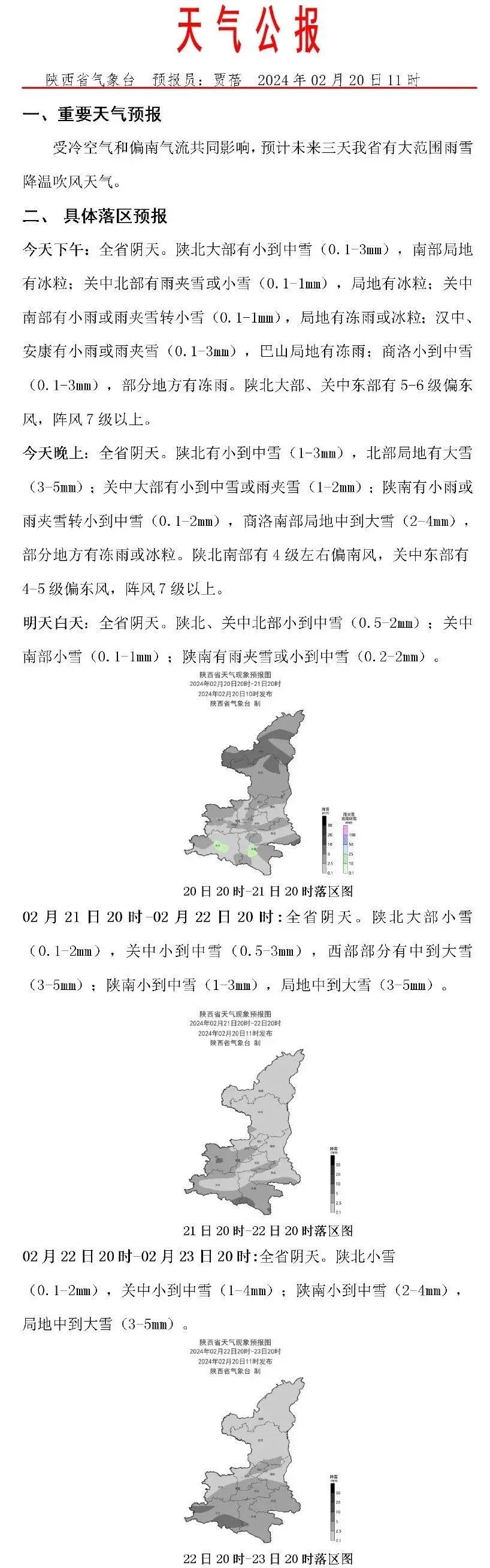 明天,新疆沿天山地区、西北地区中东部、内蒙古中西部、华北大部、黄淮、江淮、江汉、西藏等地部分地区有小到中雪或雨夹雪,其中,陕西东南部、河南东部和南部、山东东部和南部、苏皖北部、湖北北部、重庆东北部等地部分地区有大到暴雪。湖北东部和南部、湖南中北部、贵州中西部等地部分地区有冻雨。江南大部、重庆中南部等地部分地区有中到大雨,其中,江西北部、浙江西部等地部分地区有暴雨。