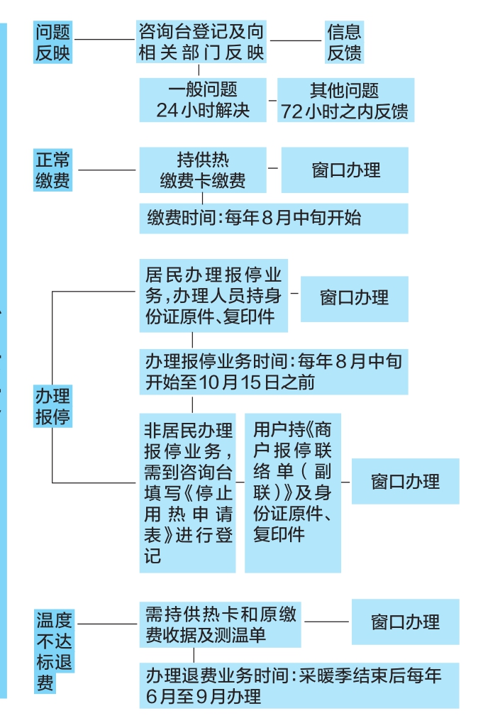 答:(1)用户需持卡缴纳当年度采暖费;(2)有历史欠费和当年度接入集中供热的既有小区用户不能在代收网点办理缴费业务;(3)不办理报停业务。
