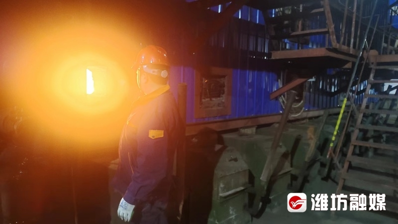 潍坊市热力有限公司西部热源厂工作人员检查锅炉燃烧情况。