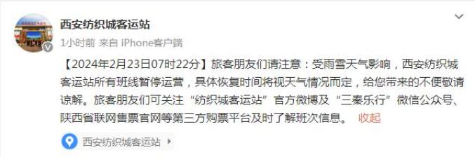 据@西安纺织城客运站:受雨雪天气影响,西安纺织城客运站所有班线暂停运营,具体恢复时间将视天气情况而定,给您带来的不便敬请谅解。旅客朋友们可关注“纺织城客运站”官方微博及“三秦乐行”微信公众号、陕西省联网售票官网等第三方购票平台及时了解班次信息。