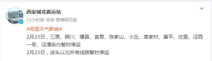 据@西安城北客运站:2月23日,三原、铜川、耀县、宜君、陈家山、小丘、袁家村、富平、庄里、泾西一号、泾渭街办暂时停运;店头以北所有线路暂时停运。