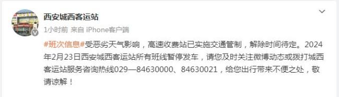 据@西安城西客运站:受恶劣天气影响,高速收费站已实施交通管制,解除时间待定。2024年2月23日西安城西客运站所有班线暂停发车,请您及时关注微博动态或拨打城西客运站服务咨询热线029—84630000、84630021,给您出行带来不便之处,敬请谅解!