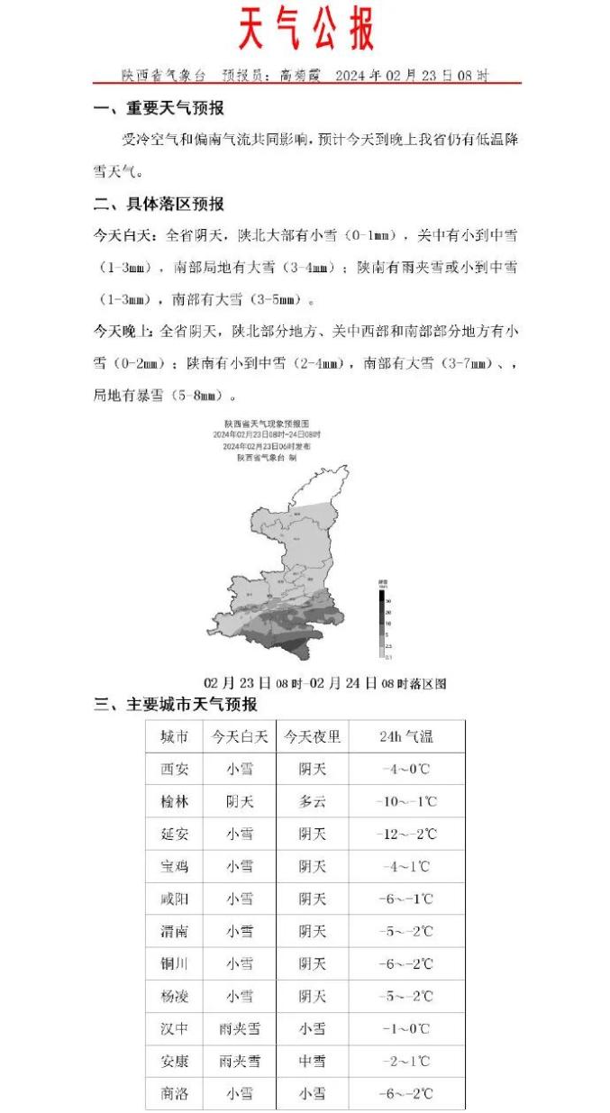 未来0-6小时:全省阴天,榆林部分地区、延安有小雪(0-1mm),西安、咸阳、商洛部分地区有大雪(3-4mm),铜川、杨凌、渭南、宝鸡有小到中雪(1-3mm),汉中、安康有雨夹雪或小到中雪(0.5-3mm)