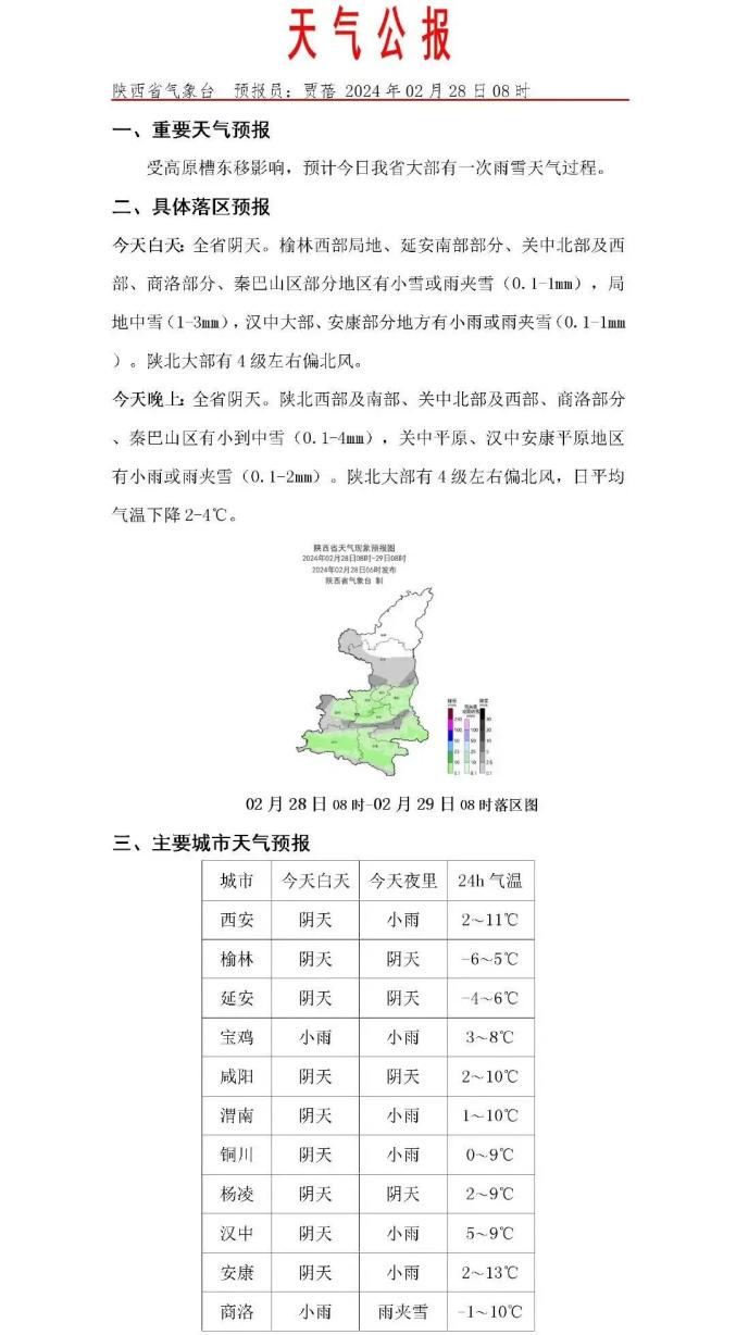 28号降水范围开始变大,除榆林大部、延安北部、西安城区、渭南、商洛西部外,都会迎来小雨(雪)或雨夹雪。