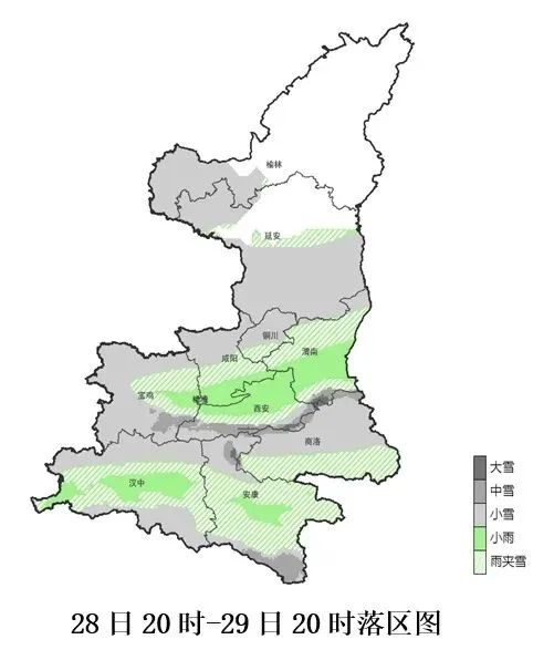 29号降水范围再次扩张,除榆林大部、延安北部外,全省均弱降水,其中宝鸡南部局地、秦巴山区局地还会有中雪。