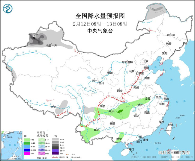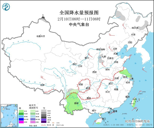 图2 全国降水量预报图(2月10日08时-11日08时)