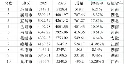 随着各地2021年经济运行成绩单陆续发布,中部地区普通地级市GDP十强排名出炉,分别是洛阳(5447.1亿元)、襄阳(5309.43亿元)、宜昌(5022.69亿元)、岳阳(4402.98亿元)、南阳(4342.22亿元)、芜湖(4302.63亿元)、赣州市(4169.37亿元)、常德(4054.1亿元)、衡阳(3840.31亿元)、九江(3735.7亿元)。