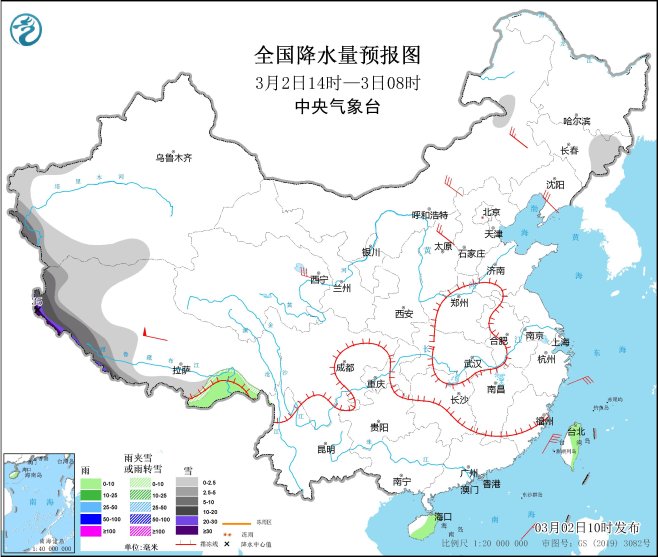 图1 全国降水量预报图(3月2日14时-3日08时)