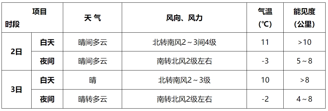 预计2日中午至3日,北京地区天气以晴为主。期间能见度有所转差,夜间最低能见度4~8公里;白天最高气温10~11℃,最低气温-3~-2℃。具体预报见附表。