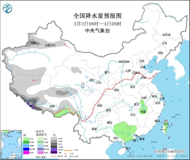 3月2日08时至3日08时,新疆南疆西部山区、西藏南部和西部等地部分地区有中到大雪,其中,新疆南疆盆地、西藏南部和西部等地部分地区有暴雪,西藏西部局地有大暴雪或特大暴雪(30~38毫米)。西藏东南部、台湾岛等地部分地区有小雨。西藏西部有4~6级风(见图1)。黄海大部、东海中南部、台湾海峡、南海大部、北部湾将有5~6级风,阵风7级。