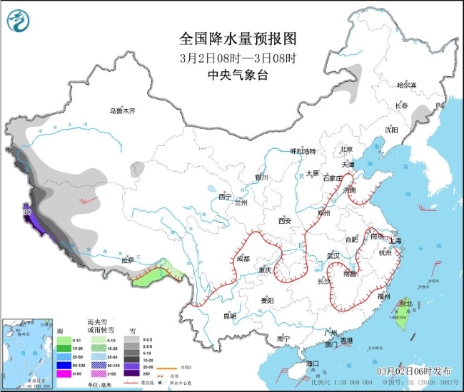 图1 全国降水量预报图(3月2日08时-3日08时)