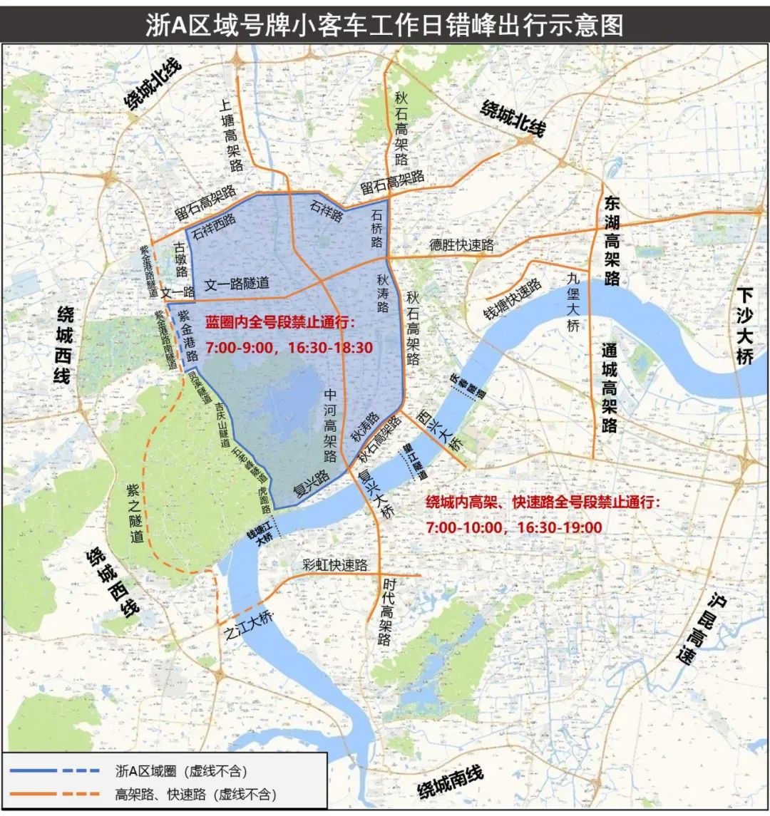 答:“浙A区域号牌”小客车可以通过紫之隧道、之江大桥或绕城西线、之江大桥由城西往返滨江。特别提醒,因彩虹快速路错峰通行,之江大桥往滨江方向要从滨文路地面道路通行。