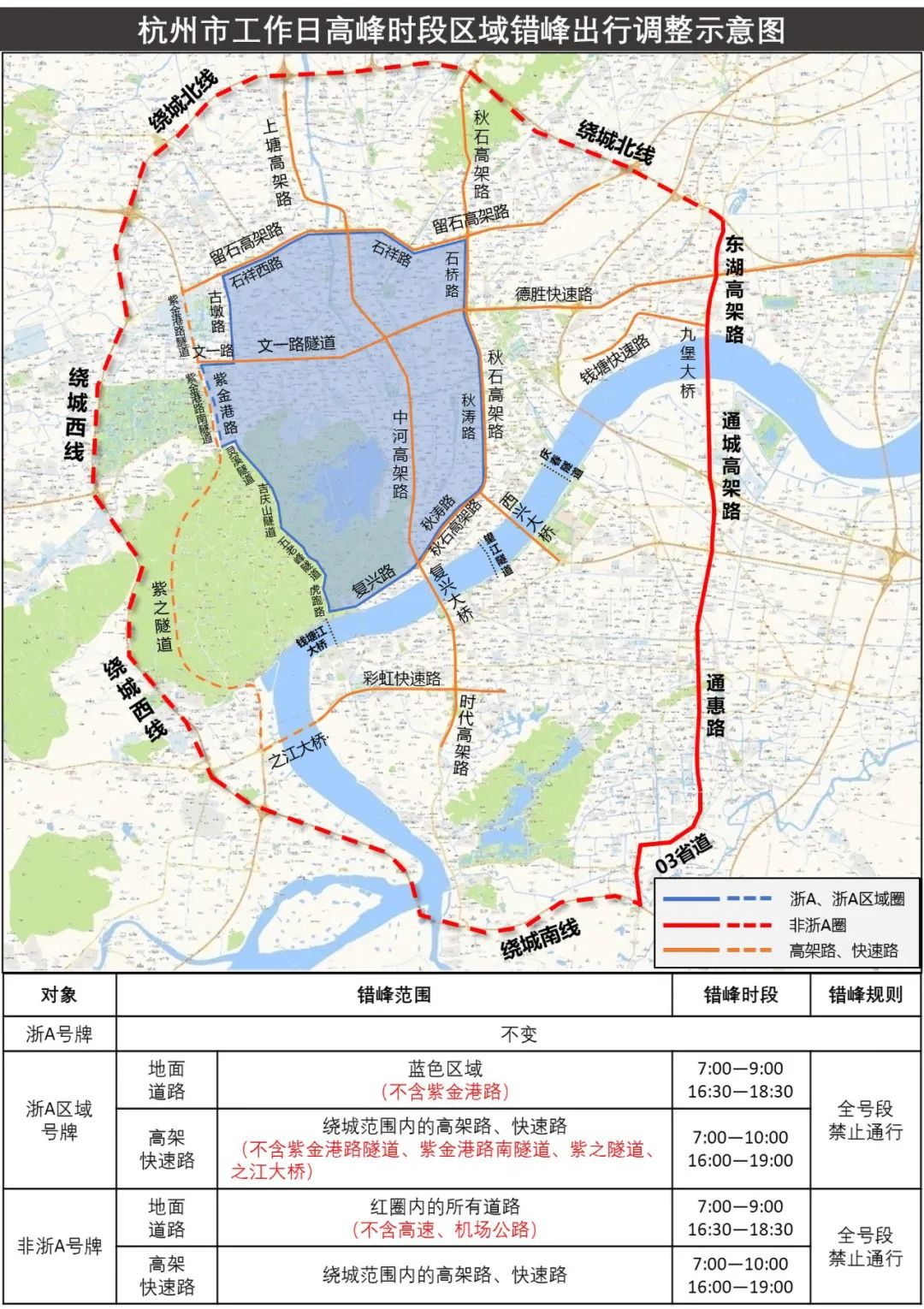 杭州市工作日高峰时段区域“错峰出行”交通管理措施调整示意图
