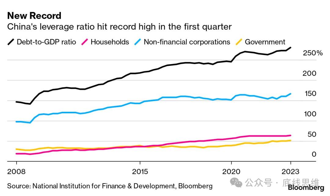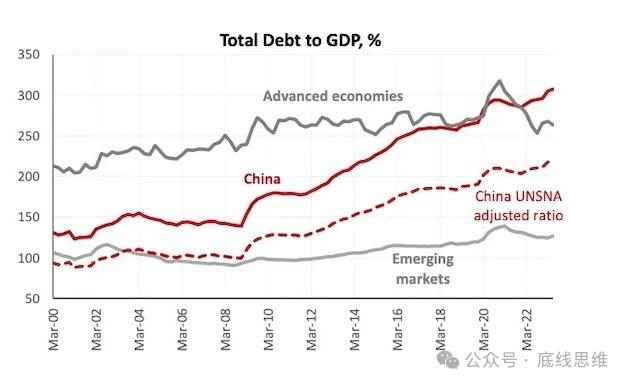 债务对GDP的比例:中国(红线)vs发达国家(深灰线)vs发展中国家(浅灰线)
